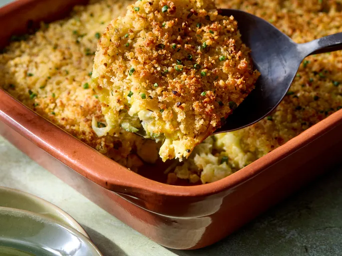 Top casserole with breadcrumb mixture and bake until golden and crisp, 10 to 15 minutes. Garnish with chives.