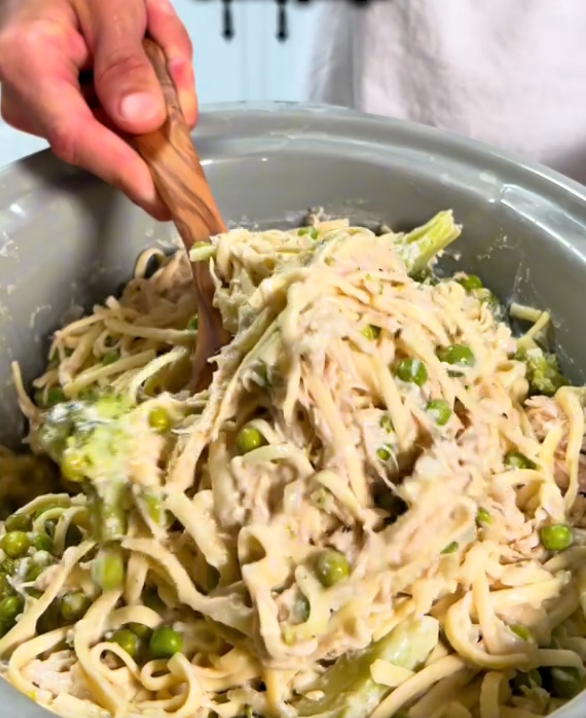 2.5 lbs (1.1 kg)boneless, skinless chicken breasts: high-protein, low-fat3-5 cupslow-sodium chicken broth (start with 3 & add more if need be)1.5 cupsunsweetened almond milk1.5 cupsnon-fat Greek yogurt: adds creaminess and protein1.5 cupsreduced-fat cream cheese: lower calorie option3/4 cupgrated Parmesan cheese: for flavor5 clovesgarlic, minced1.5 mediumonions, finely chopped1.5 tspdried basil1.5 tspdried oregano1.5 tspblack pepper or to taste3/4 tspSalt or to taste1.5 lbs(675g) protein pasta noodles3 cupsbroccoli florets1.5 cupsfrozen peas