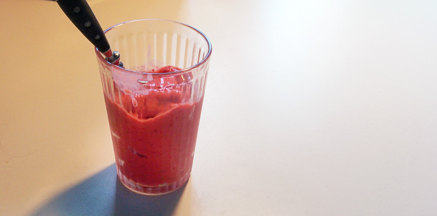Add into a bowl and blend using an immersion blender – a proper blender probably works quicker, but I haven’t got one – until smooth. If it’s too thick to efficiently blend, add a bit more water. Fill into glases and enjoy.